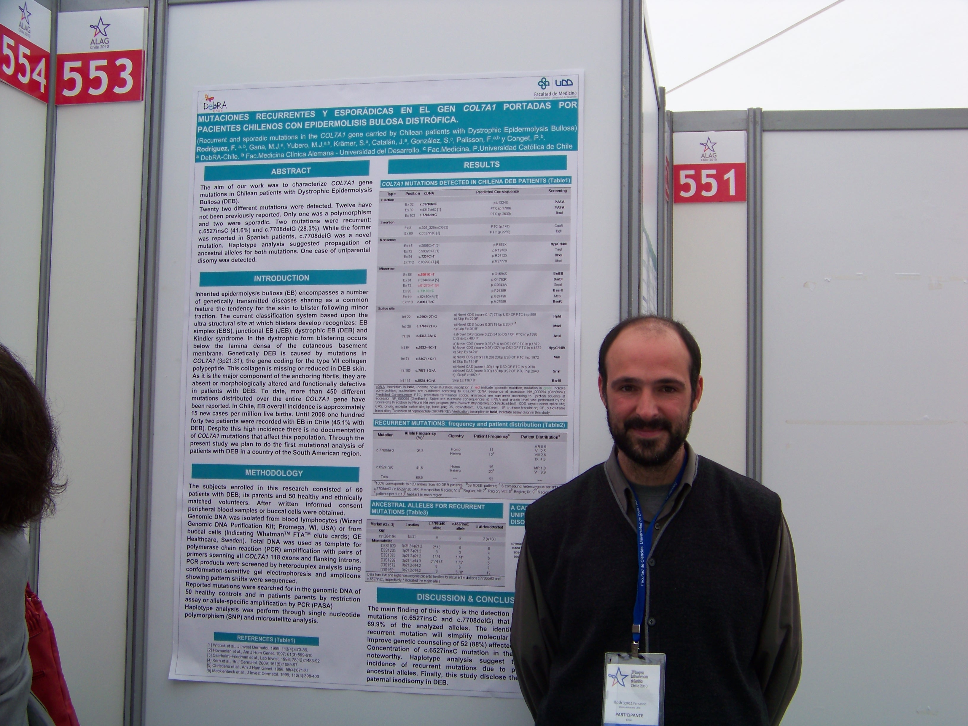 MUTACIONES RECURRENTES Y ESPORÁDICAS EN EL GEN COL7A1 PORTADAS POR PACIENTES CHILENOS CON EPIDERMOLISIS BULOSA DISTRÓFICA. (Recurrent and sporadic mutations in the COL7A1 gene carried by Chilean patients with Dystrophic Epidermolysis Bullosa) Rodríguez, F. a, b, Gana, M.J.a, Yubero, M.J.a,b, Krämer, S.a, Catalán, J.a, González, S.c, Palisson, F.a,b y Conget, P.b aDebRA-Chile. bFac.Medicina Clínica Alemana – Universidad del Desarrollo. cFac.Medicina, P.Universidad Católica de Chile.