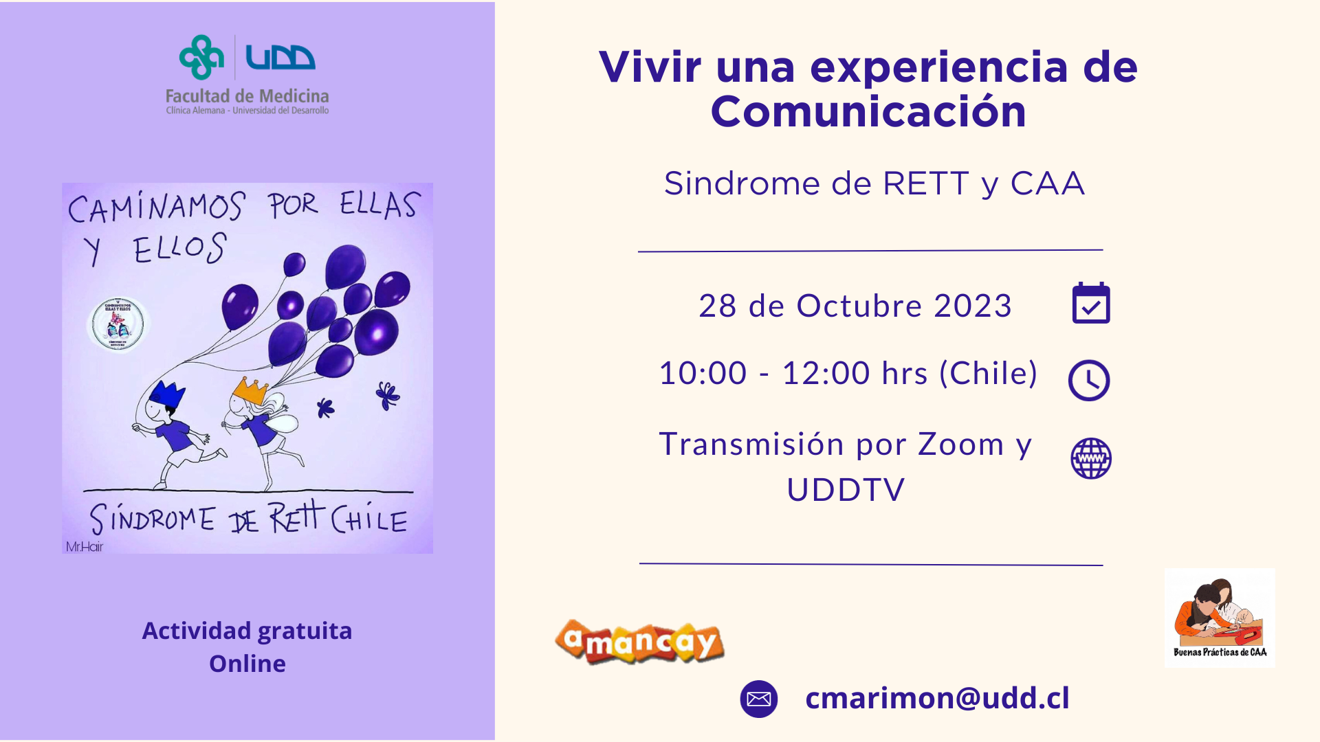 La charla “Vivir una oportunidad de Comunicación”, se presenta como una actividad dentro del mes de la Concientización sobre el Síndrome de Rett que se conmemora en todo el mundo durante octubre. Es por eso que la carrera de Fonoaudiología de la Facultad de Medicina Clínica Alemana Universidad del Desarrollo, se suma a estas actividades invitando a esta charla, cuyo objetivo es crear conciencia sobre el uso de intervenciones de Comunicación Aumentativa y Alternativa que puede ayudar a las personas con Síndrome de Rett a acceder a la comunicación a través de sistemas de alta tecnología que, de acuerdo a la evidencia, se adecuan más a sus características y necesidades, mejorando así la calidad de sus vidas.