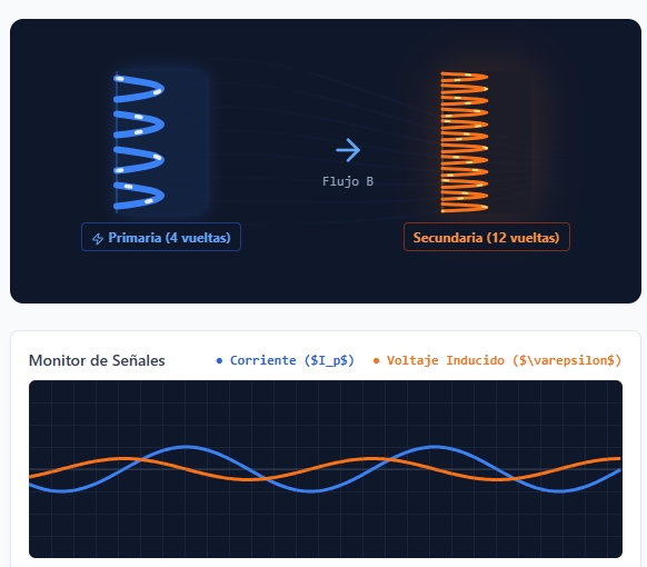 Observación clave: Fíjate en los gráficos. El pico de voltaje inducido (naranja) ocurre cuando la corriente (azul) pasa por cero (máxima pendiente de cambio).
