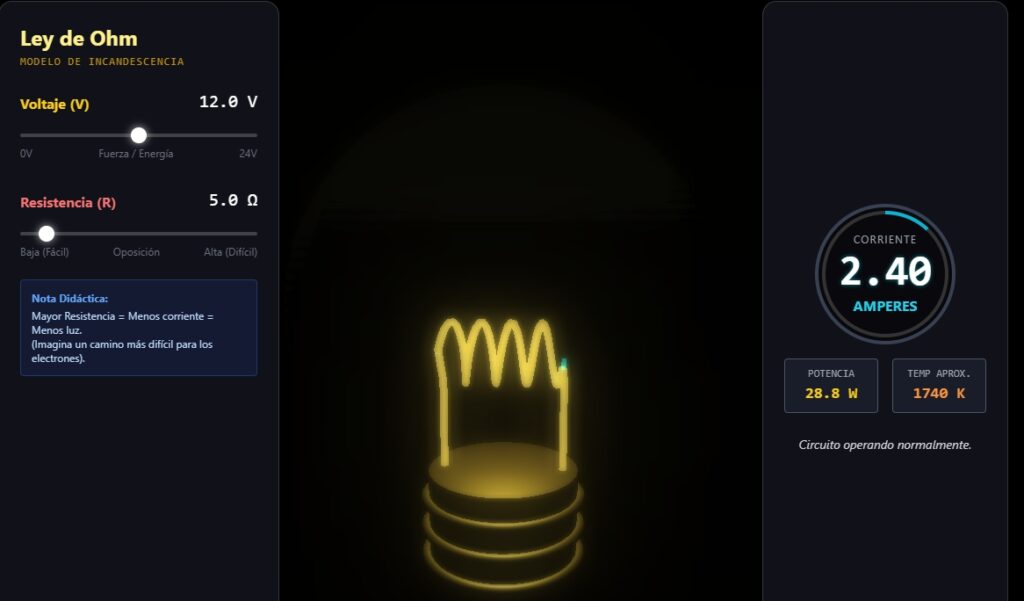 Este simulador calcula la corriente (I) en tiempo real dividiendo el valor del slider de Voltaje (V) por el de Resistencia (R).