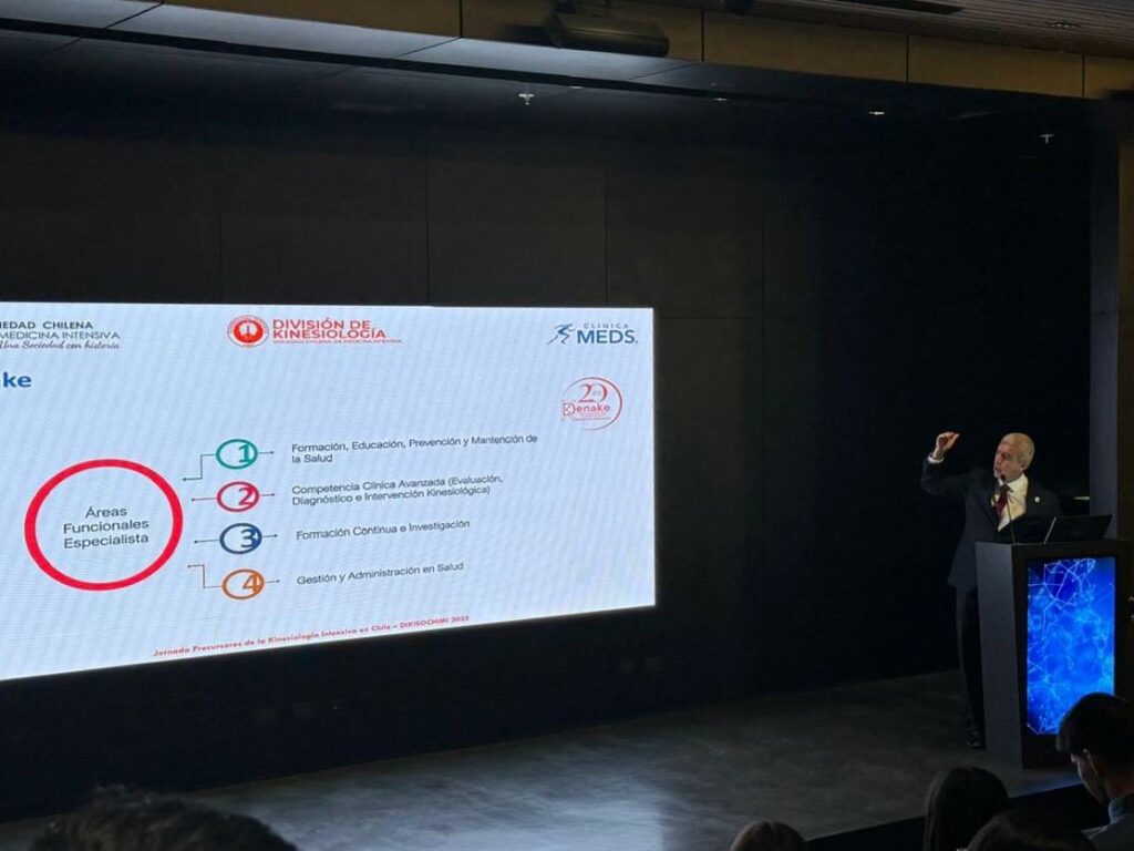 Jorge Molina, quien además es presidente de la DENAKE (Asociación Nacional de Acreditación de Kinesiólogos Especialistas), presentó en el módulo titulado “Gestión y cimientos de la Kinesiología Intensiva en Chile”, donde abordó el desarrollo de esta especialidad en el país y el rol de DENAKE en la acreditación de profesionales del área.