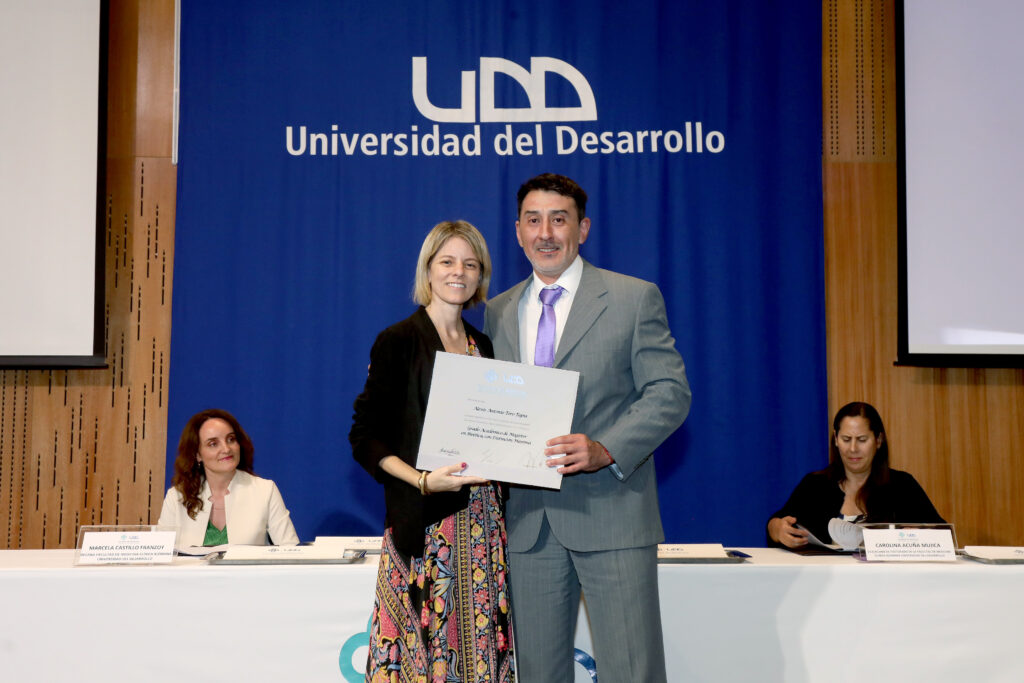 Posteriormente, se realizó la entrega de diplomas, seguida del Premio Universidad del Desarrollo, que reconoce la excelencia académica. Los galardonados fueron Fernanda Ortíz Orellana, del Magíster en Terapia Física y Rehabilitación, y Javier Quillodrán Peredo, del Magíster Interuniversitario en Bioética.
