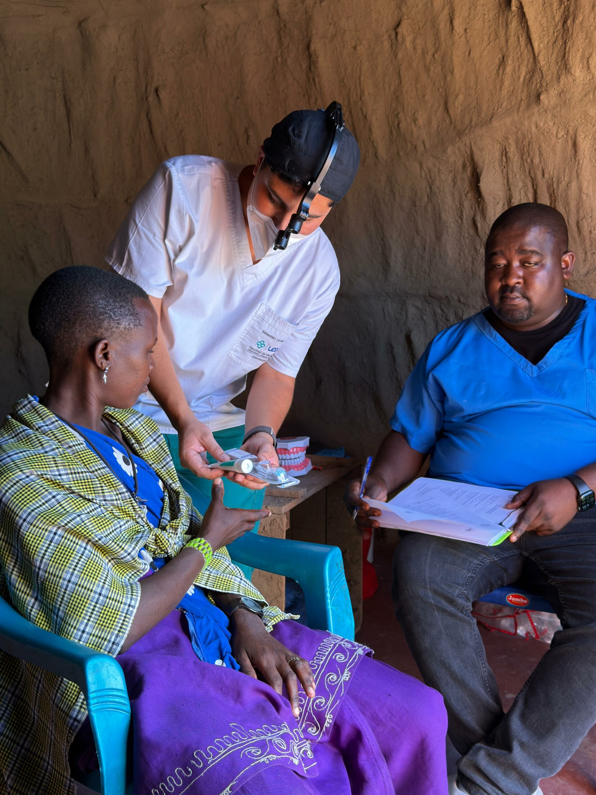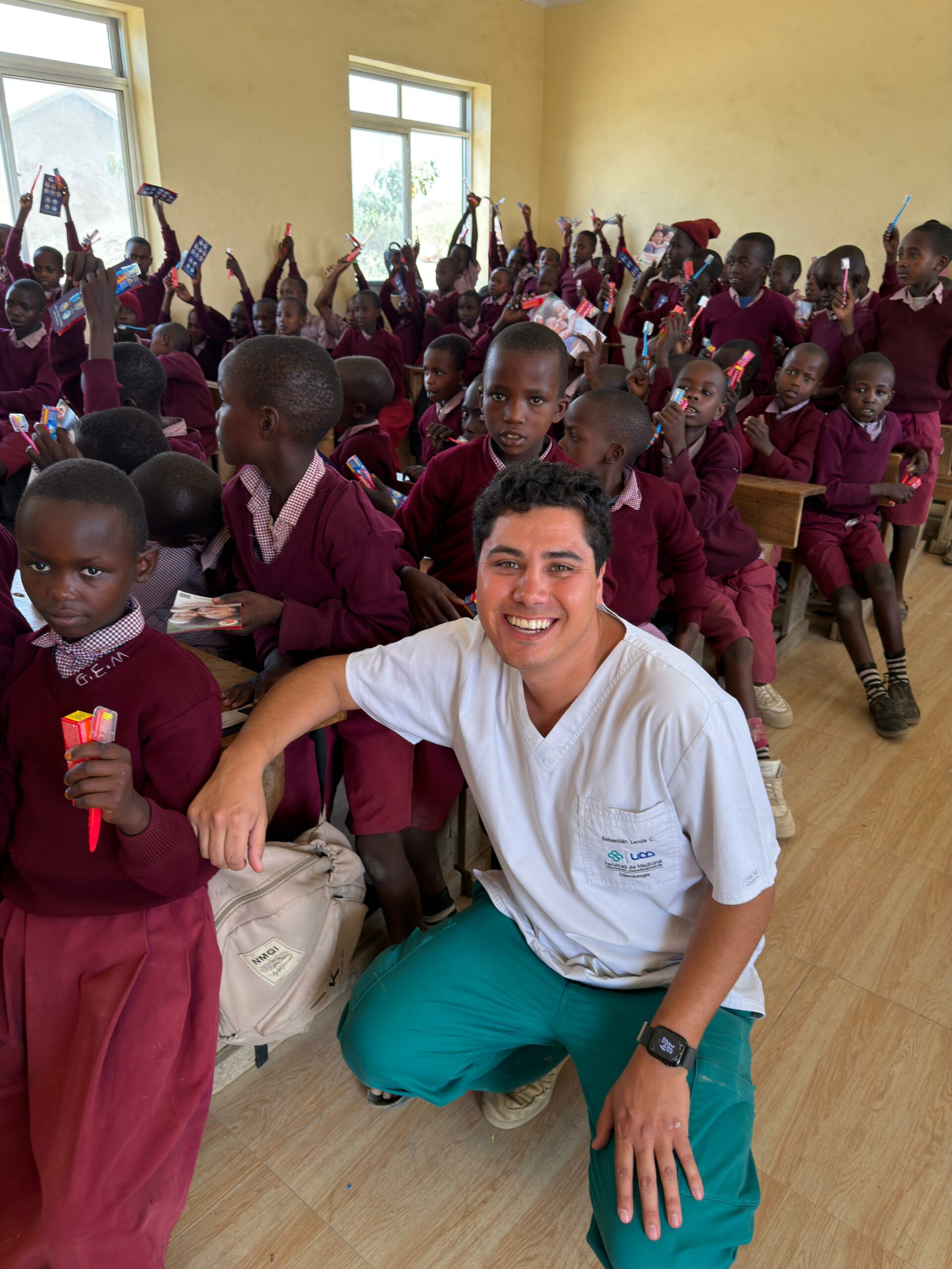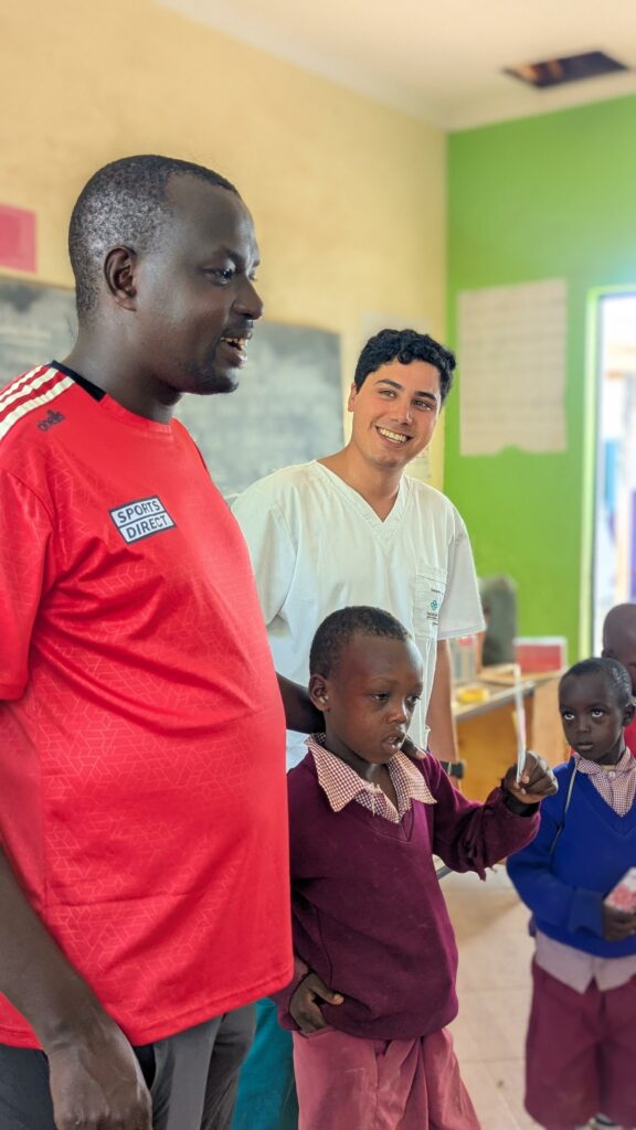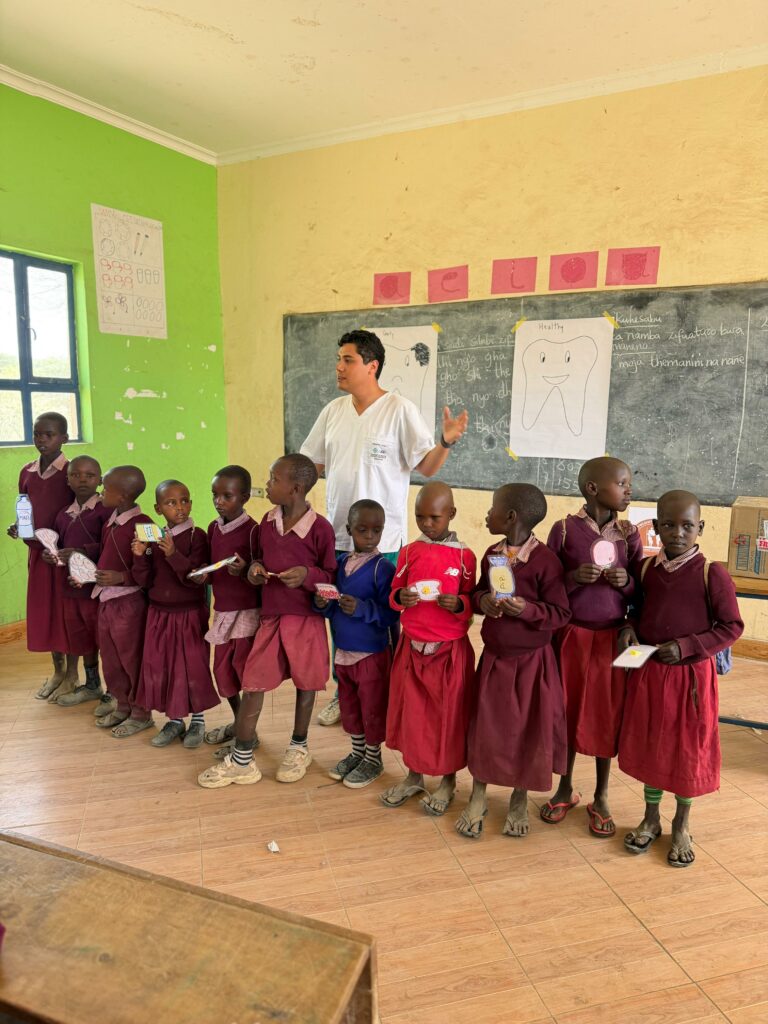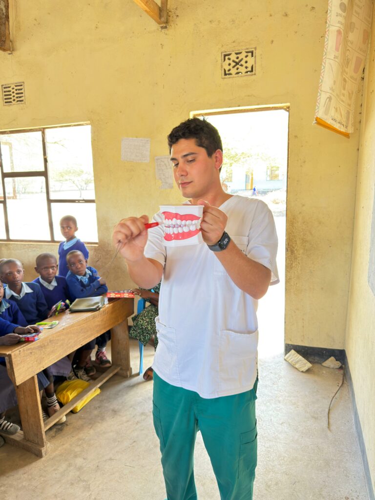 Asimismo, trabajó en la promoción de hábitos de higiene bucal, abordando el uso del mswaki, una rama de árbol que tradicionalmente utilizan como cepillo dental. Sebastián investigó y orientó sobre las ramas más adecuadas —más suaves y menos abrasivas—, adaptó técnicas de cepillado y explicó los beneficios del cepillo dental convencional. Además, gracias a donaciones de Oral-B y Colgate, entregaron kits de higiene dental que incluían cepillos y pasta, tanto en comunidades como en tres escuelas de aldeas Maasai, donde también realizaron actividades educativas para niños.