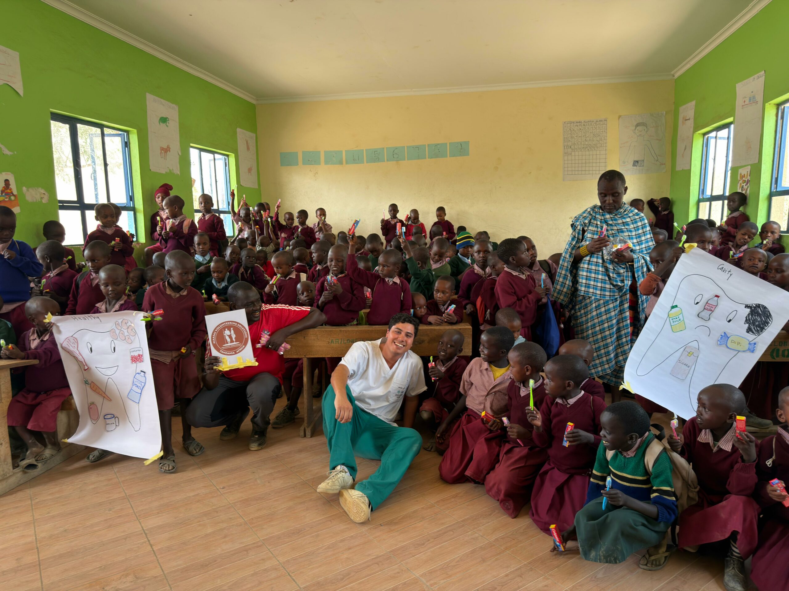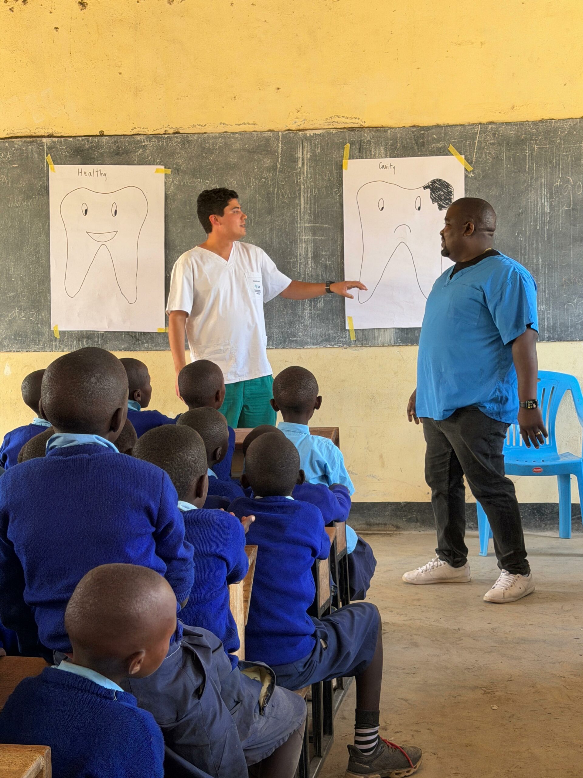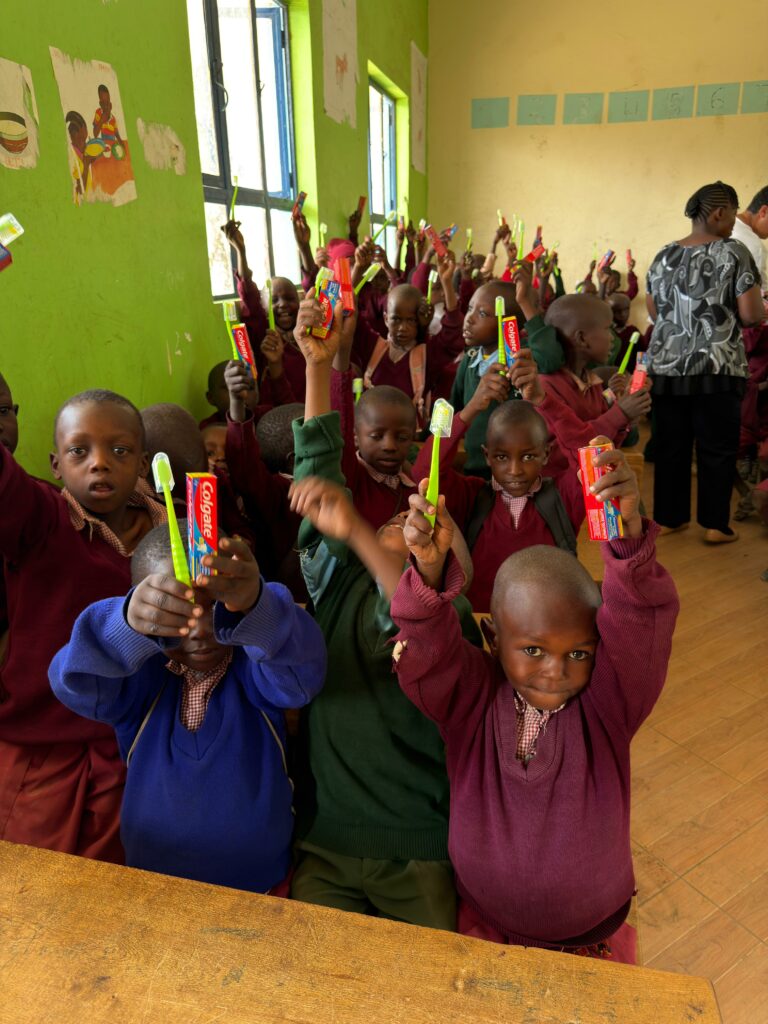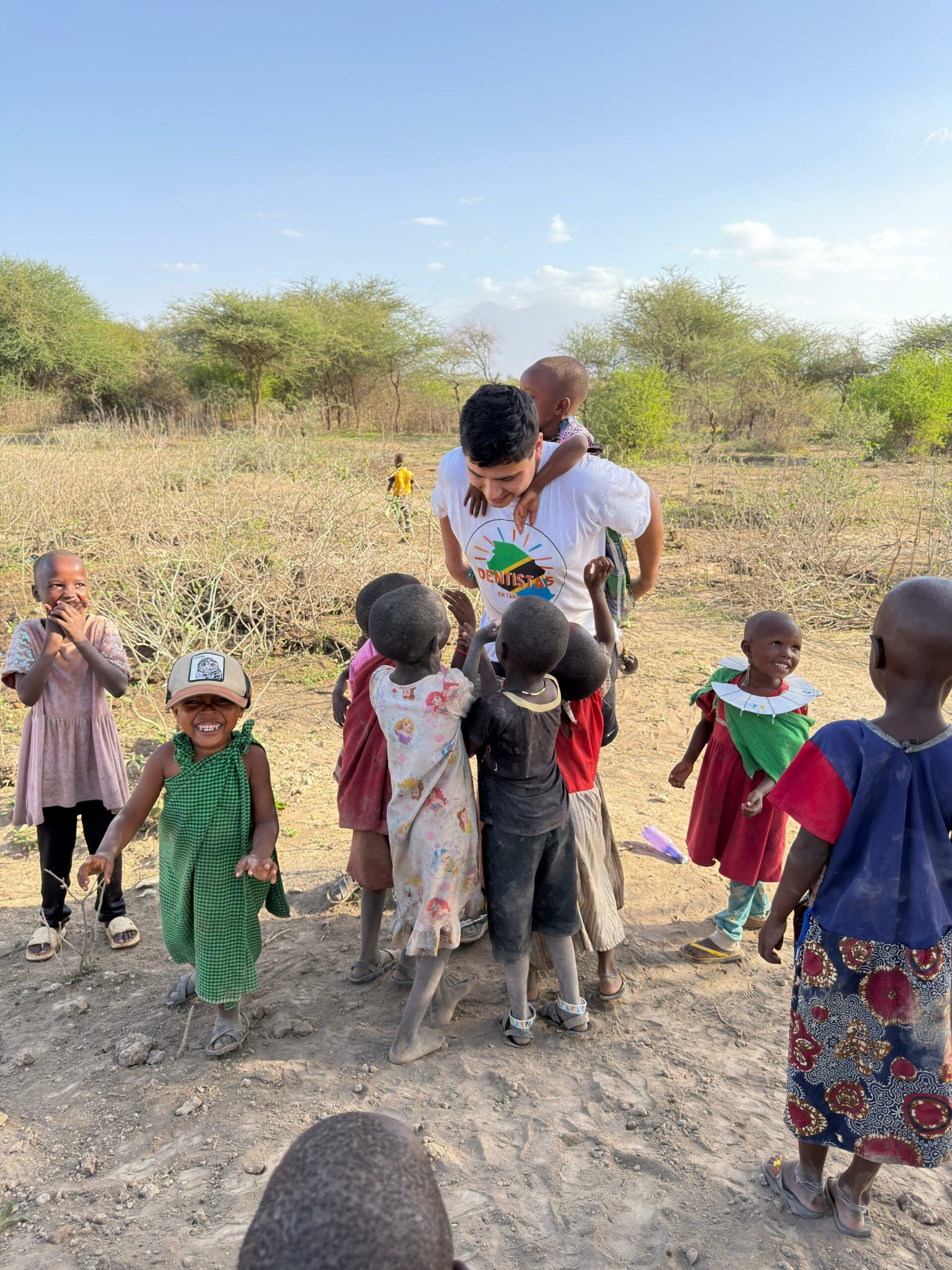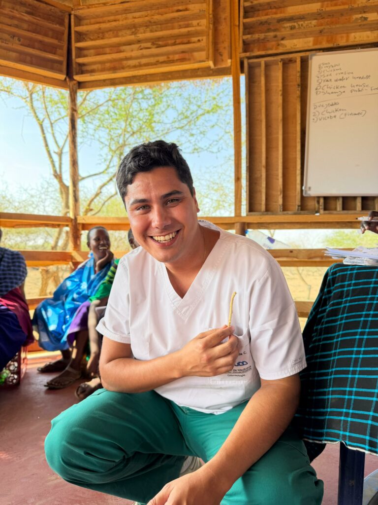 Asimismo, trabajó en la promoción de hábitos de higiene bucal, abordando el uso del mswaki, una rama de árbol que tradicionalmente utilizan como cepillo dental. Sebastián investigó y orientó sobre las ramas más adecuadas —más suaves y menos abrasivas—, adaptó técnicas de cepillado y explicó los beneficios del cepillo dental convencional. Además, gracias a donaciones de Oral-B y Colgate, entregaron kits de higiene dental que incluían cepillos y pasta, tanto en comunidades como en tres escuelas de aldeas Maasai, donde también realizaron actividades educativas para niños.