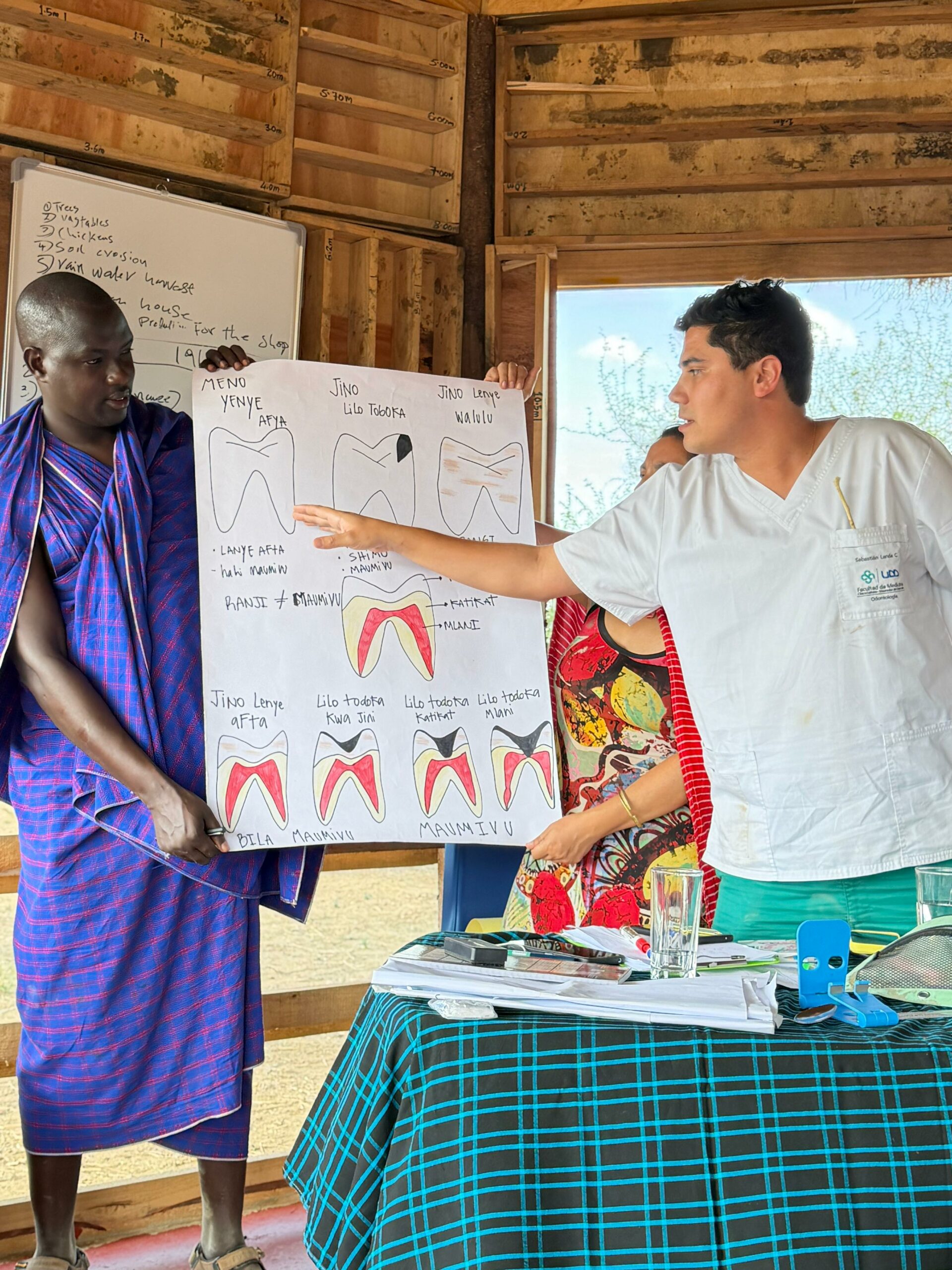 Entre las primeras temáticas abordadas estuvo la fluorosis dental, una alteración del esmalte producida por la ingesta excesiva y crónica de flúor durante la formación de los dientes, condición altamente prevalente en la zona debido a la elevada concentración de flúor en el agua de Arusha. “Era importante que entendieran de dónde viene esto y cuáles son sus signos, y que también pudieran diferenciar cuándo hay dolor por caries”, señaló.