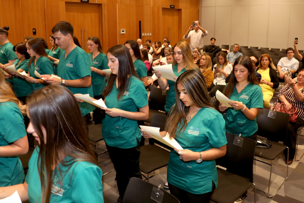 Este simbólico evento marca el inicio de una nueva etapa en la formación de los estudiantes, quienes comienzan el ciclo de Licenciatura y visten por primera vez su uniforme, representando un mayor compromiso con la profesión y un acercamiento más directo a su futuro rol como profesionales de la salud.