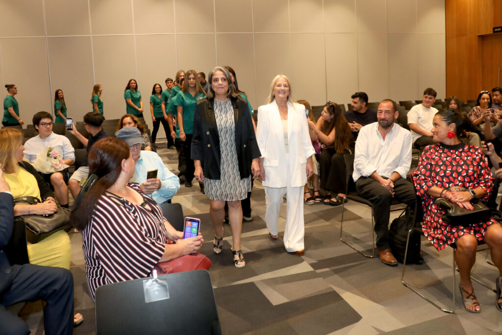 La ceremonia contó con la presencia de la decana de la Facultad de Medicina Clínica Alemana Universidad del Desarrollo, Dra. Marcela Castillo, y de la vicedecana de las carreras de la Salud, Dra. Liliana Jadue, quienes se dirigieron a los estudiantes y sus familias destacando la relevancia de este hito en su trayectoria académica y el compromiso que implica formarse para el cuidado de las personas.